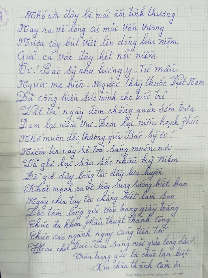 Trên đây là đôi dòng tâm sự chân tình, đầy cảm động được trích từ bài thơ “Ra viện” của bà Nguyễn Thị Văn 61 tuổi, người vừa được phẫu thuật điều trị thành công bệnh thoái hóa cột sống nặng.