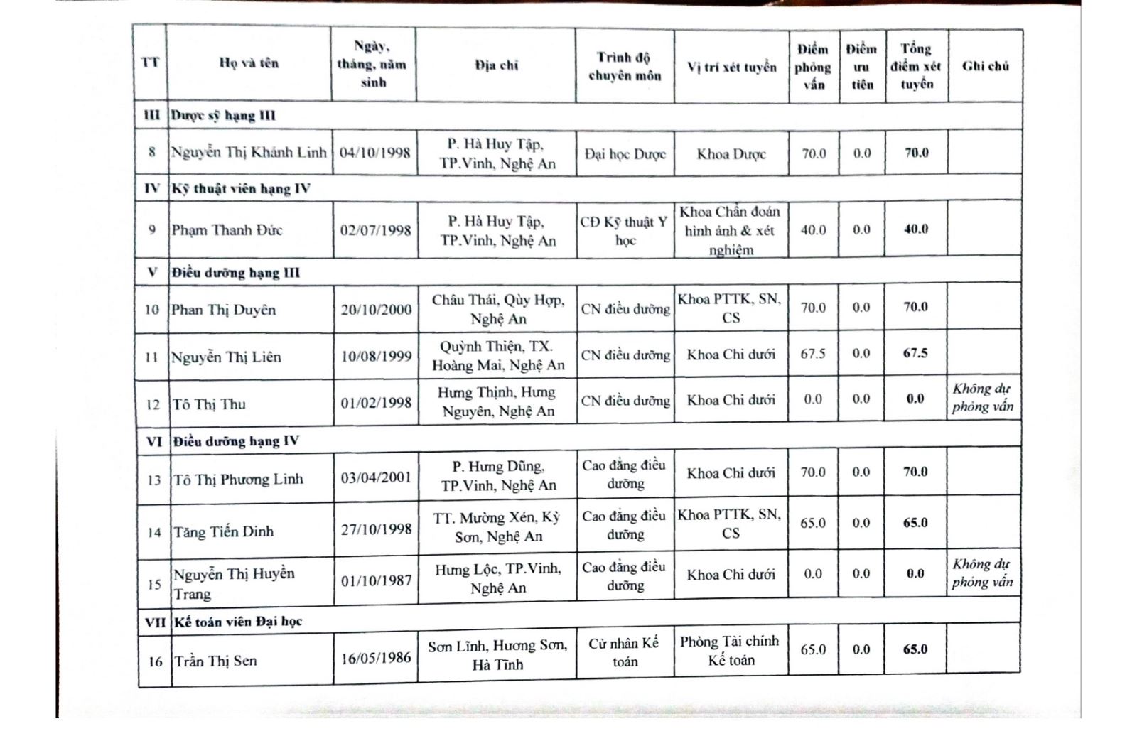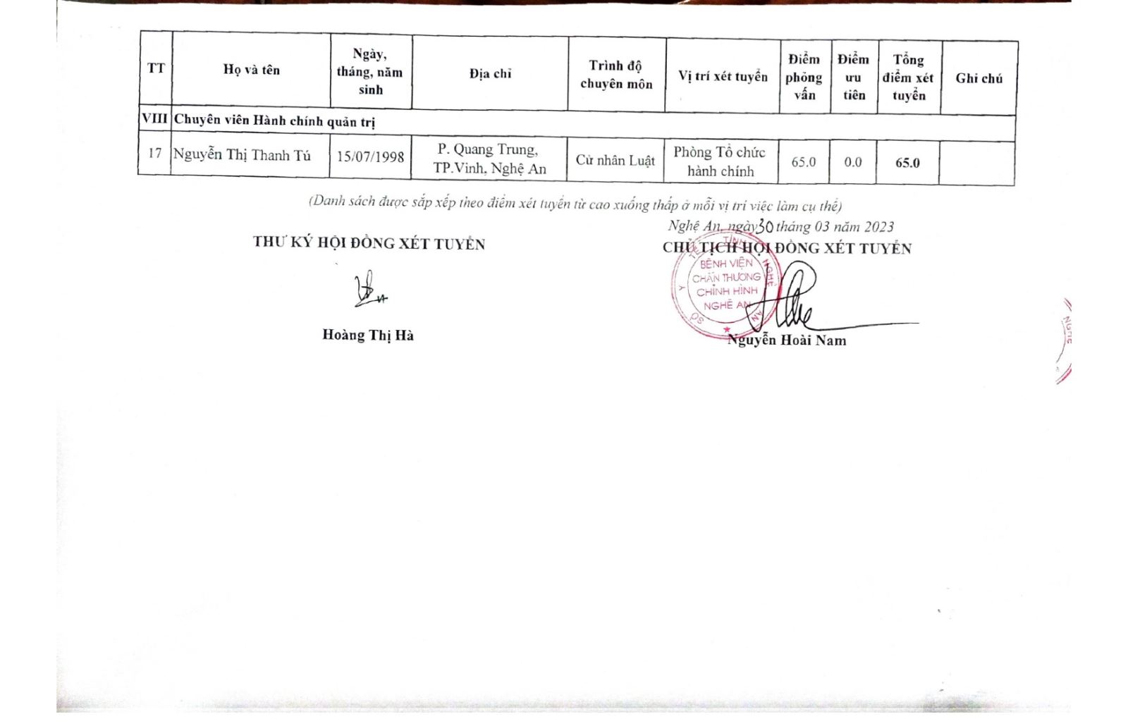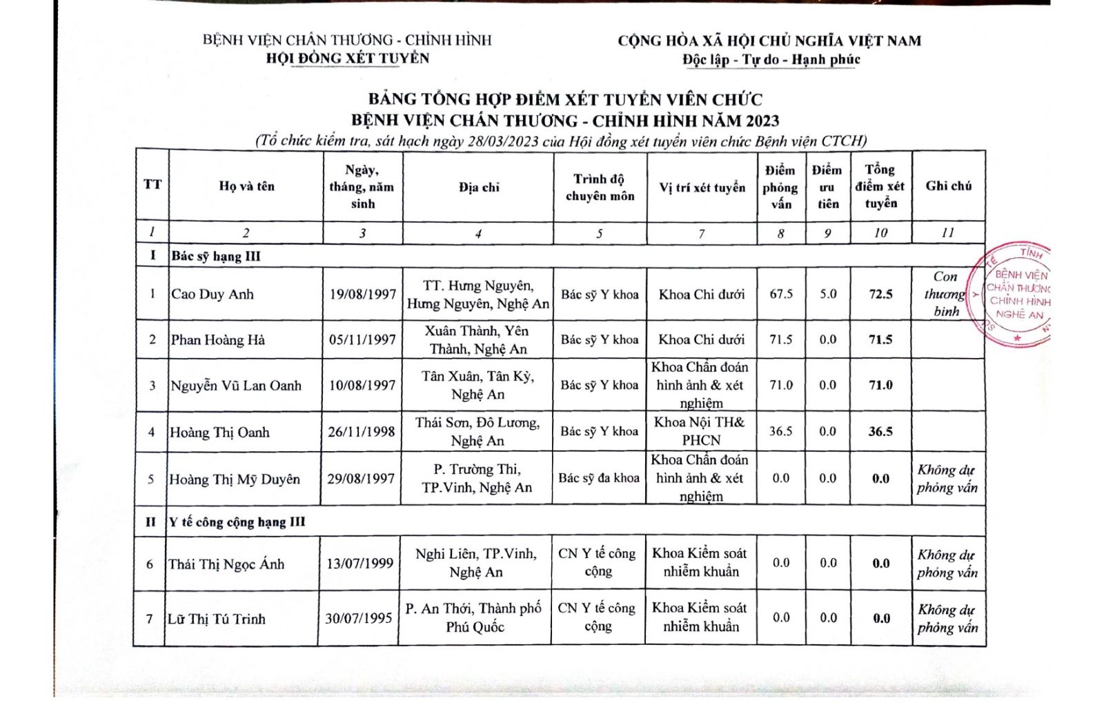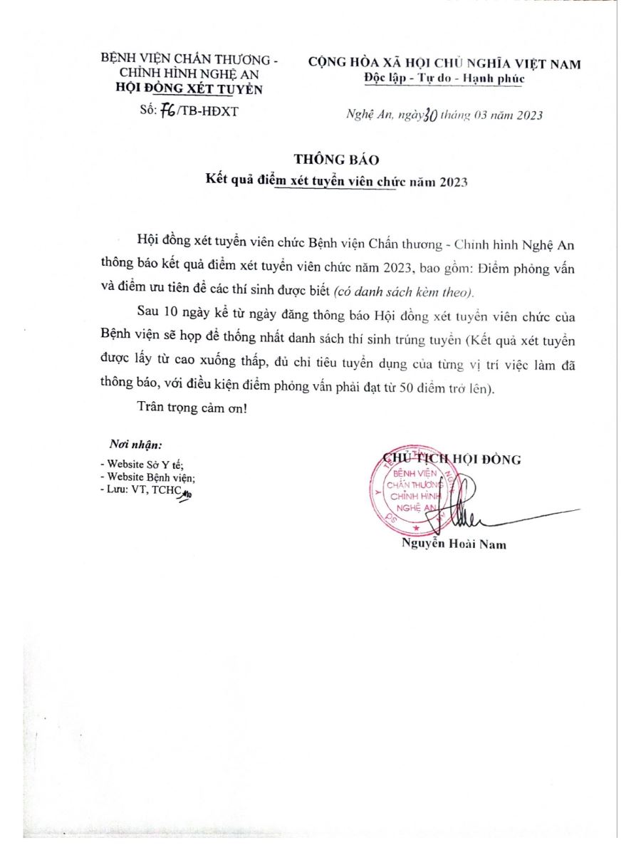 Hội đồng xét tuyển viên chức Bệnh viện Chấn thương - Chỉnh hình Nghệ An thông báo kết quả điểm xét tuyển viên chức năm 2023 như sau: